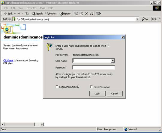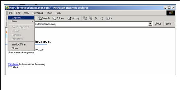 1. Abra el Internet Explorer u Alguna Ventana del Sistema. 2. Ingrese en la barra de direcciones la siguiente dirección ftp://tudominio.com, .net, .org, etc. 3. Introduzca sus datos de inicio de sesión Usuario: Contraseña: